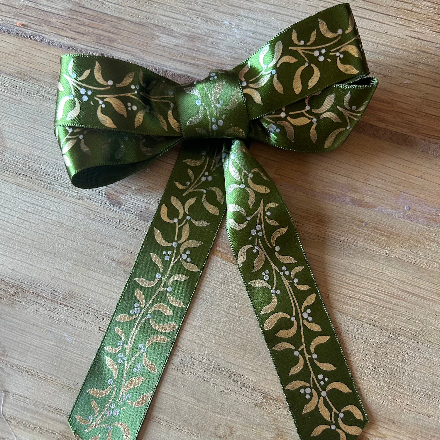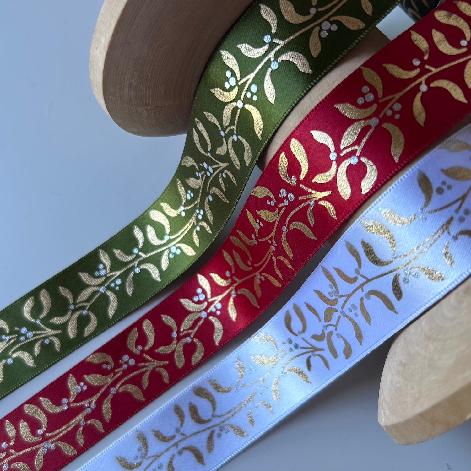 Our Berisfords Mistletoe Wishes Ribbon is a luxurious Christmas satin ribbon, measuring 25mm. The printed satin features an elegant continuous mistletoe garland design printed in gold and silver metallics. The ribbon additionally pays homage to the enchanting myth of mistletoe, symbolising love, and peace, making it a perfect choice for adding a touch of elegance to your festive decorations and gift wrapping.Whether you’re looking for a traditional Christmas cake ribbon, or simply creating stunning bows. ‘Mistletoe Wishes’ will bring a sophisticated touch to any project.